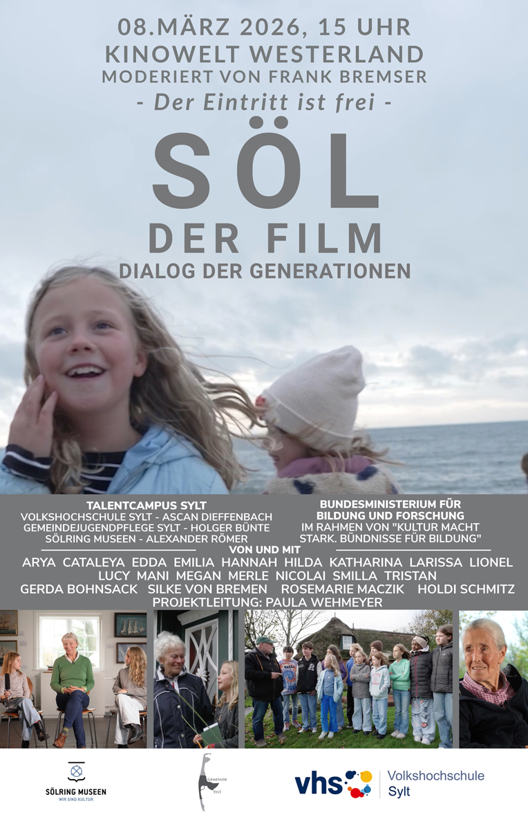 Kinowelt Westerland Strandstraße 9, Sylt / Westerland„SÖL – Dialog der Generationen“ am 08. März in der Kinowelt Westerland erleben Nach der erfolgreichen Premiere im Januar und der sehr gut besuchten öffentlichen Vorführung in der Sylt Bibliothek wird das Filmprojekt „SÖL – Dialog der Generationen“ nun auch auf der großen Leinwand gezeigt. Am Sonntag, den 08. März 2026, um 15:00 Uhr lädt […]